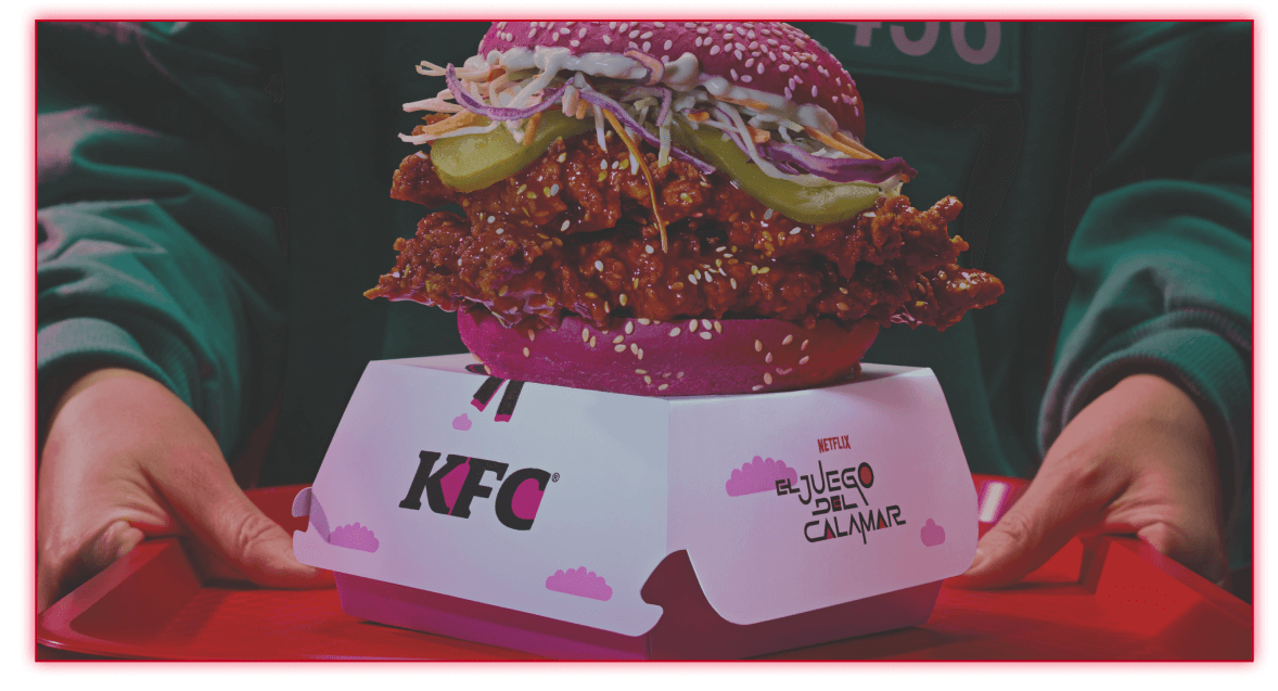 Por favor, prestad atención. El siguiente juego se llama KFC x El Juego del Calamar. Burger, alitas y tiras de pollo frito glaseado en salsa coreana. Disponibles por tiempo limitado.